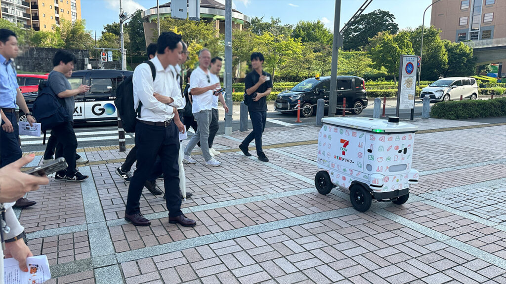 イベントは、屋外での実証実験見学から始まりました。令和3年度 開発プロモーターであるReGACY Innovation Group株式会社の成果として、LOMBY社とセブン-イレブン・ジャパンが実施する自動走行ロボットによる屋外配送サービスを視察。これは、セブン-イレブンの商品お届けサービス「7NOW」の注文品を、屋外型自動走行ロボット「LOMBY」が配送するものです。