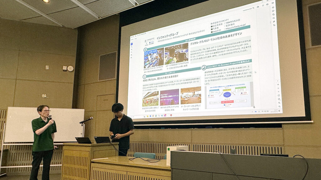 インフォシティグループからは高野が登壇し、放送・スポーツ・エネルギーなど多様な分野での知見を活かし、「地域に飛び込み、開かれた場で未来を紡ぐ」をテーマに、大学キャンパスをフィールドとした次世代通信技術と次世代人材による実証推進計画を発表しました。