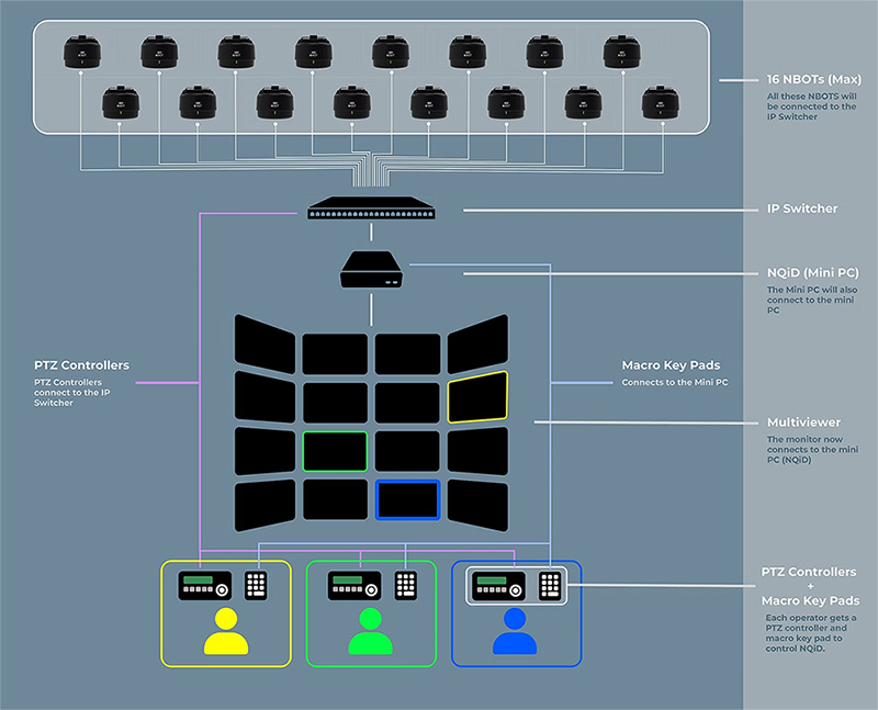 Salrayworksブース内でひと際注目を集めたのが、技術参考展示として紹介された「N QiD(エヌクイッド)」です。これは、わずか3名のオペレーターで最大16台もの電動雲台(N BOT)を制御可能にする、強力なNDIソリューションです。ボタンひとつで制御対象を瞬時に切り替え、複数のカメラアングルをスムーズに行き来できるため、スピード感が求められる制作現場に最適です。