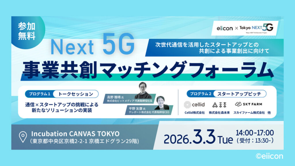 3月3日(火)、事業会社・スタートアップ・支援機関等の新たな連携創出につながる機会を目的としたオープンイベント「Next5G 事業共創マッチングフォーラム ー次世代通信を活用したスタートアップとの共創による事業創出に向けてー」が開催されました。 本フォーラムでは、東京都が実施する次世代通信技術活用型スタートアップ支援事業において、実際にプロジェクトを牽引してきた「開発プロモーター」とスタートアップによるトークセッションやネットワーキングを通じて、スタートアップと事業会社や支援機関が交わる「繋がりを創出する場」となりました。