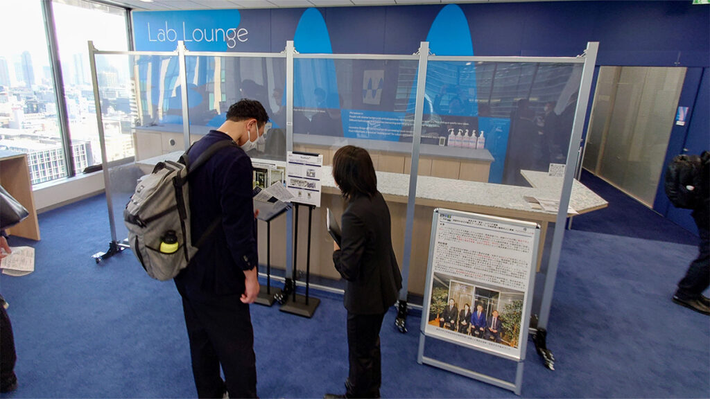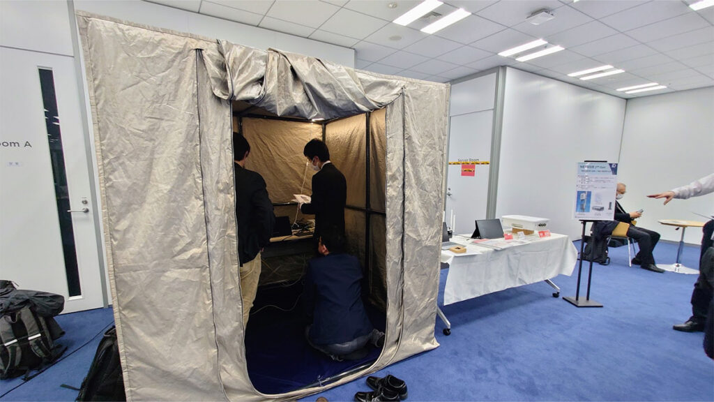 会場エリア内で同じ周波数帯で検証される2社の展示の干渉対策として、プースの間に反射板を静態展示。