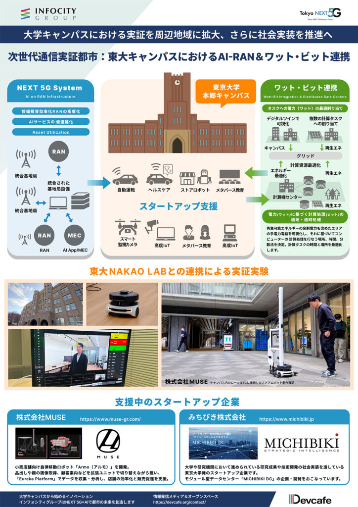 この中でインフォシティグループが紹介したのは、東京都が実施する「次世代通信技術活用型スタートアップ支援事業(Tokyo NEXT 5G Boosters Project)」において開発プロモーターとして推進している「次世代通信実証都市」の構想です。